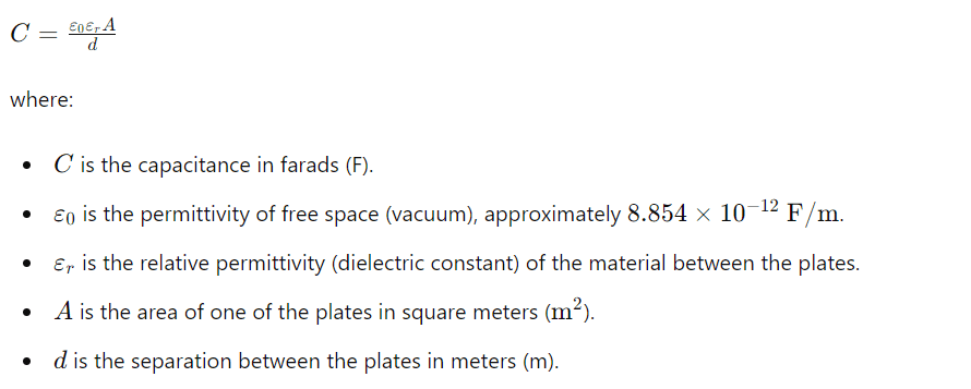 The capacitance CCC of a parallel plate capacitor can be calculated using the formula: